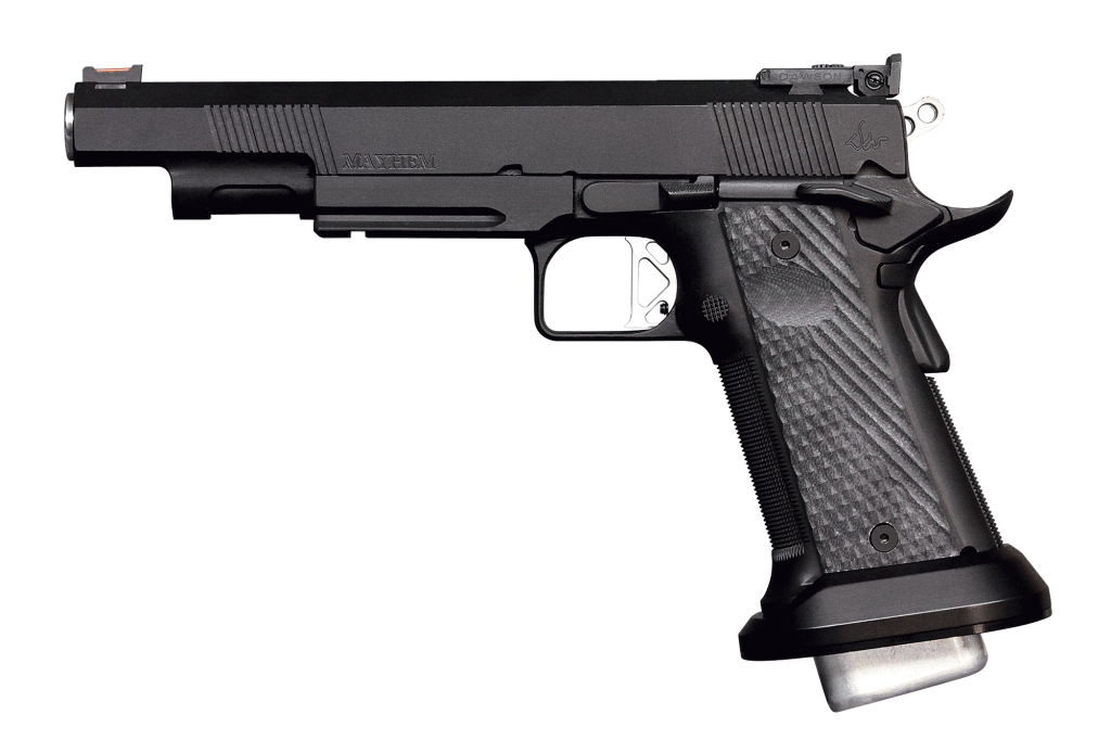 The Mayhem is based on an all steel, hi-capacity version of the 1911 frame. It comes ready to dominate the Limited IPSC/USPSA division or fulfill the needs of shooters looking for a superbly accurate target-grade 1911. Taking weight away from where you don’t want it and adding it to where you do was the first priority in designing this handgun. The 6 inch bull barrel and tactical rail add to the static “good weight.” We wanted a 6 inch long slide for the added sight radius and enhanced pointability, but that would add to the “bad weight”, so the 6 inch slide has been lightened to equal the weight of a 5 inch. The result is a 6 inch long slide that balances and feels like a 5 inch but shoots like a 6 inch. The combination of the all steel frame with industry-leading parts delivers the most well-balanced, softest shooting 6 inch limited gun on the market. The Mayhem is truly a handgun made for shooters by shooters. (.40 S&W)