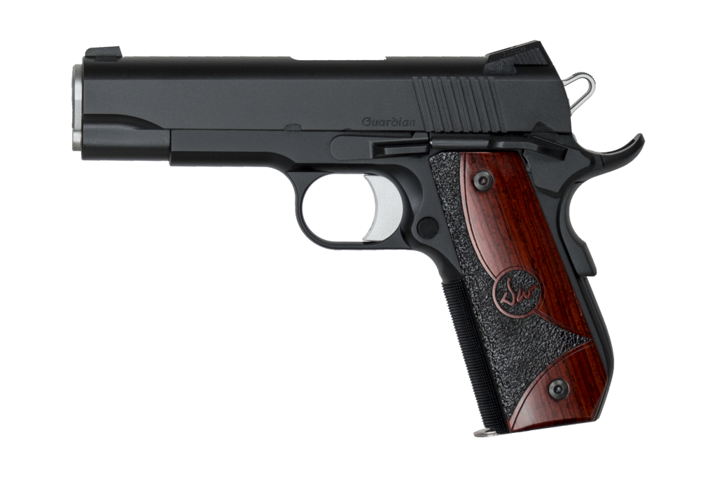 We have combined the best features from two of our most popular models, the bobbed Commander and the CCO. The Guardian has an anodized aluminum frame and an aluminum bobbed mainspring housing to help reduce printing when carrying concealed and make it comfortable enough for full-time carry. The Duty Black finished Commander-length slide and alloy frame give it just the right feel and balance. If you are looking for a lightweight Commander-sized 1911 in 9mm, 38 Super or 45 ACP, don’t pass up the Guardian.