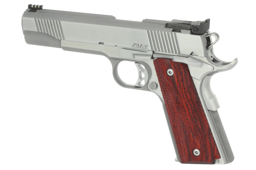 The forged stainless frame has an undercut trigger guard to get the hand a little higher on the pistol and 25 LPI front strap checkering to hold it firmly in place without being too harsh. Flats on this pistol are soft brushed while the rounds are sandblasted, giving a nice contrast. Double diamond cocobolo grips finish it off.