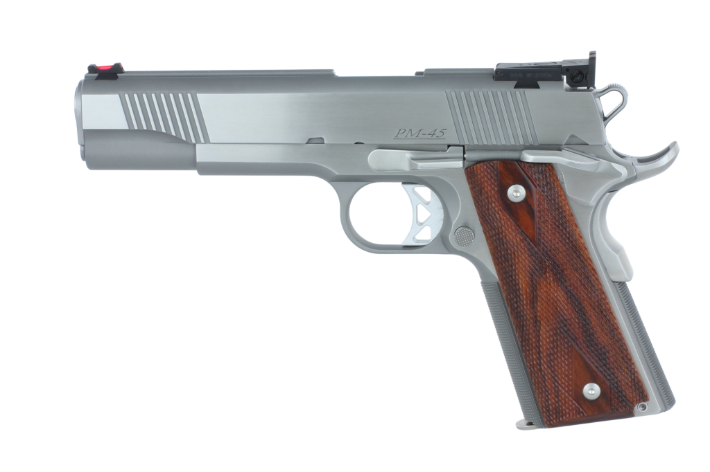 The Pointman series has been offered in limited quantities in the past, and demand always outpaces production capacity. Featuring our serrated rib on top of the forged slide, it has an adjustable target sight in the rear and fiber optic sight in the front, and front and rear cocking serrations. The frame is forged stainless with an undercut triggerguard and 25-LPI frontstrap checkering. The flats are polished to a soft brushed finish, and the rounds are sandblasted for a nice contrast. Double diamond cocobolo grips finish it off.