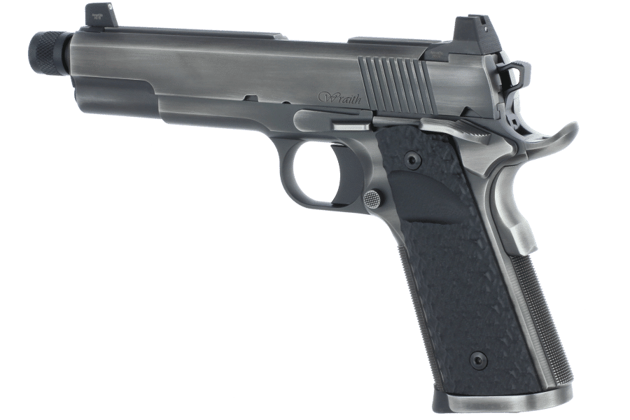 The Wraith is a threaded Government-size 1911 available in 45 ACP, 10mm or 9mm and wears a distressed version of our Duty finish. A stainless pistol underneath this mottled exterior, any parts that aren’t distressed are blacked out. Some grippy stippled G10 grips are cut short to accommodate a magwell, and the slide wears a set of high night sights.